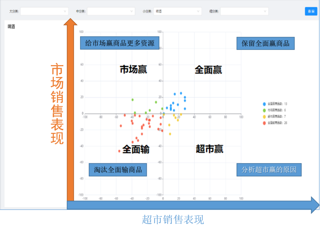 除此之外还存在市场和超市销售表现相反的两种现象,如果市场表现好、超市表现弱为市场赢,相反则超市赢,与之对应不同的去留操作。市场赢单品,超市应该给予更多资源,带动其在门店的销售;超市赢则超市可以对其中原因进行分析,然后尝试如此运作其他类似品。
