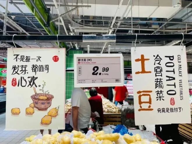 在上海大润发多家门店内可以看到,蔬菜区张贴着文案幽默的海报,胡萝卜、包菜、土豆等蔬菜被列为“冷宫蔬菜”,小葱、大蒜、可乐等成了“超市顶流”。