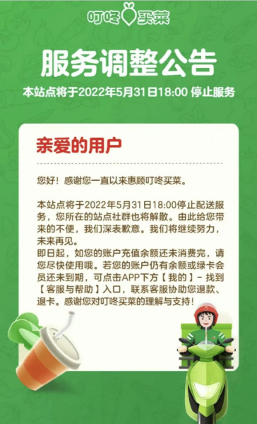 图示:叮咚买菜服务调整公告。
