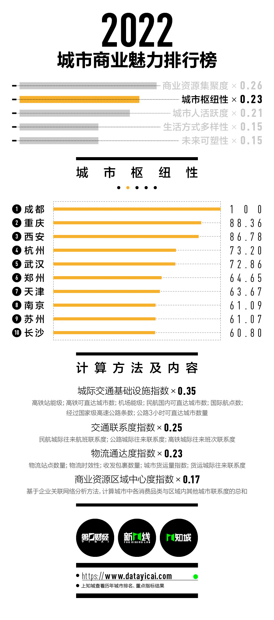 排行榜说明:商业魅力指数满分不为100,最高分为一线城市的最高值,即上海的141.80分。为便于读者理解,新一线城市最高分呈现为100分。