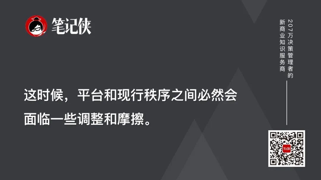 同时,平台又挖到了“大数据”这么一个新生产要素的矿,开始对社会生产力、生产关系都产生影响。这时候,平台和现行秩序之间必然会面临一些调整和摩擦。