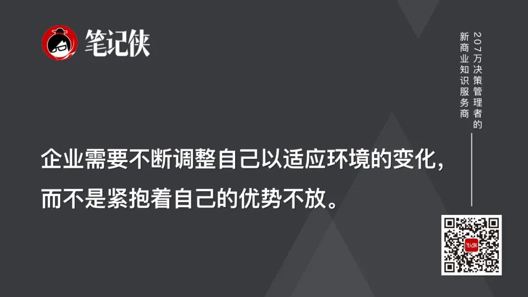 企业需要不断调整自己以适应环境的变化,而不是紧抱着自己的优势不放。大部分情况下,企业的优势是随着时间变化而调整的,如果不能够与时俱进,优势将会成为企业发展的障碍。