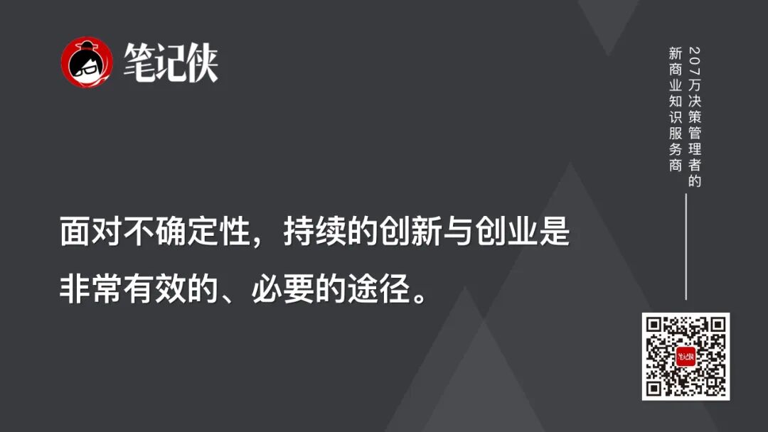 重复这两个词的内在含义,就是想表达这样一个想法,面对不确定性,持续的创新与创业是一个非常有效的、必要的途径。