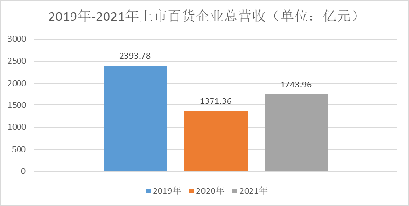 但仍未恢复到疫情前的水平。2019年,20家上市企业总营收2393.78亿元,对比之下2021年仍有649.82亿元的巨大缺口,下滑了27.15%。其中,渠道分流、行业竞争给百货业的恢复带来更多挑战,百货行业仍待纾困、恢复生气。
