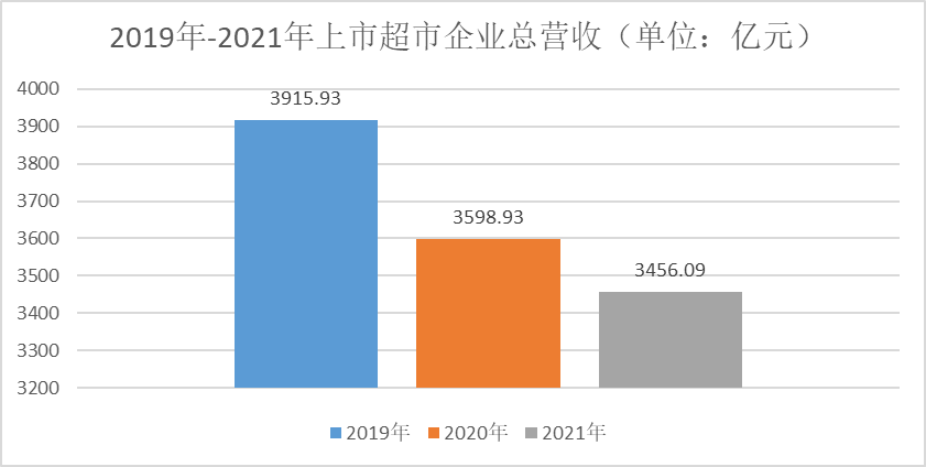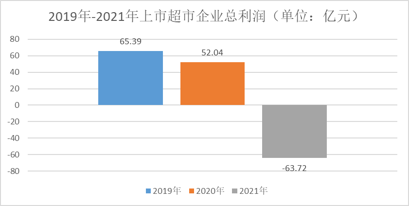 近三年,超市行业陷入严重下滑危机,23家上市超市企业2019年、2020年、2021年总营收分别为3915.93亿元、3598.93亿元、3456.09亿元;总利润由2019年的盈利65.39亿元转至2021年的亏损63.72亿元,净利率不断刷低。