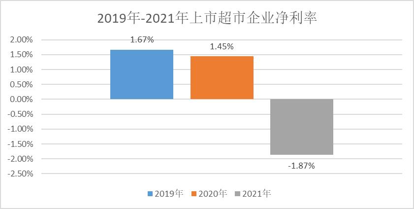 近三年,上市超市企业净利率也不断刷低,由正利率1.67%转向负利率1.87%。