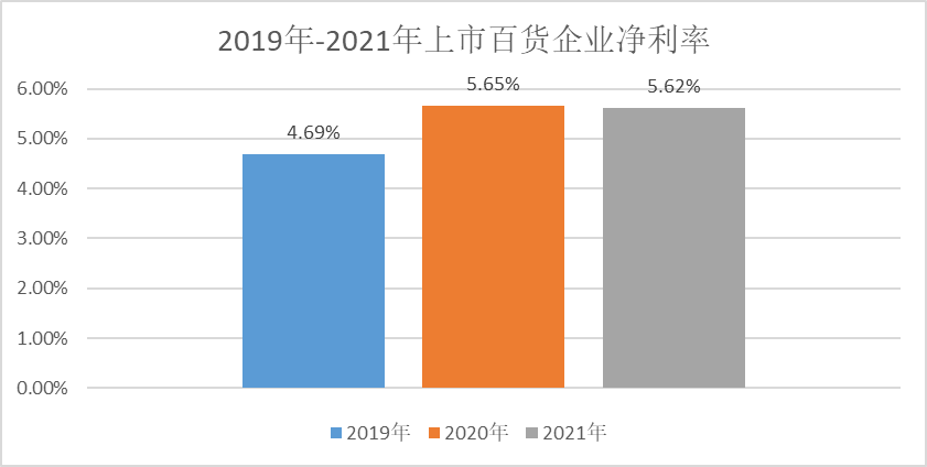 然而近三年,上市百货企业净利率却在缓慢上升,由2019年的4.69%升至2021年的5.62%。说明企业对效益和经营质量的更多重视。