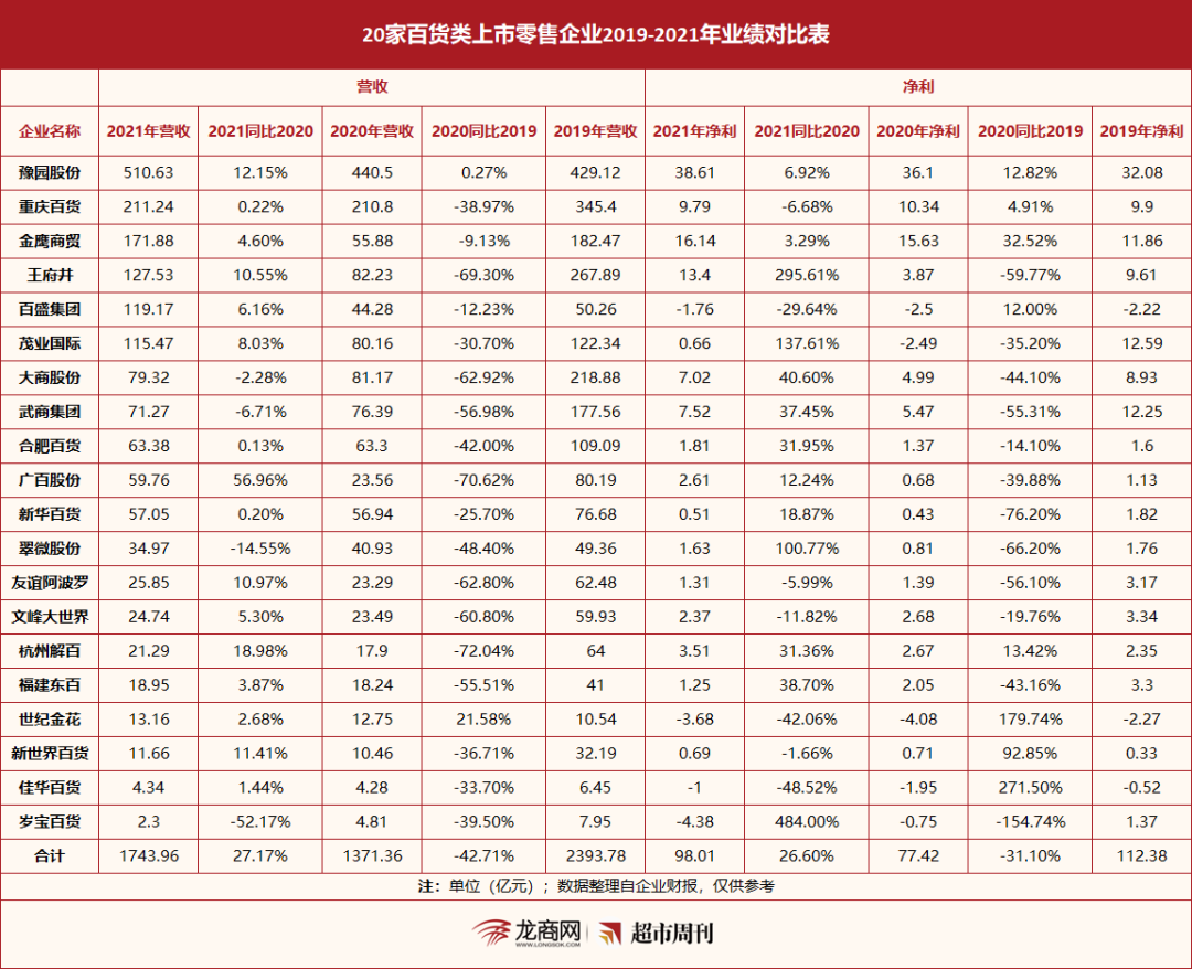 同比疫情前的2019年,20家上市百货企业总净利下滑了12.8%,利润额度不如从前。