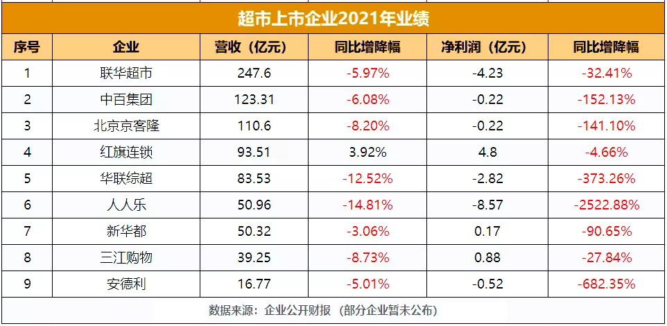 据统计,截止到目前公布2021年业绩数据的12家超市企业中9家出现了亏损,平均亏损金额超过5亿元。而去年同期,仅一家企业出现亏损。