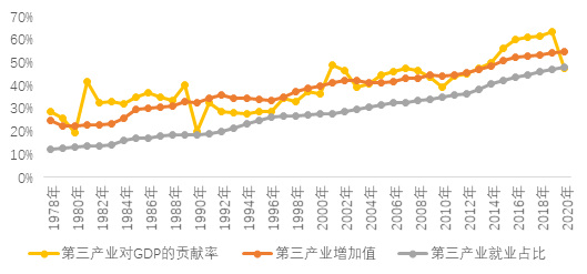 图4 改革开放以来我国服务业主要指标变化(1978-2020)