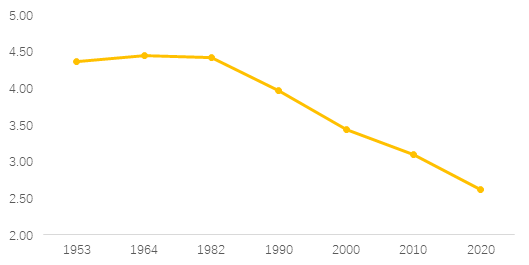 图5 1953-2020年中国家庭户均人口规模变化趋势(人/户)
