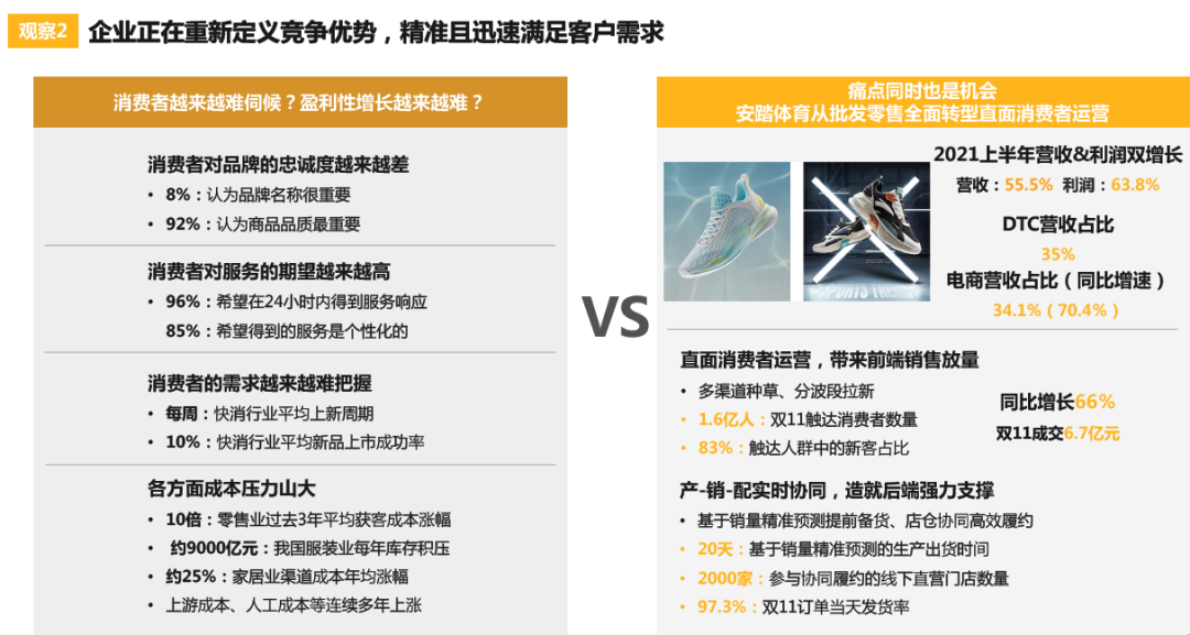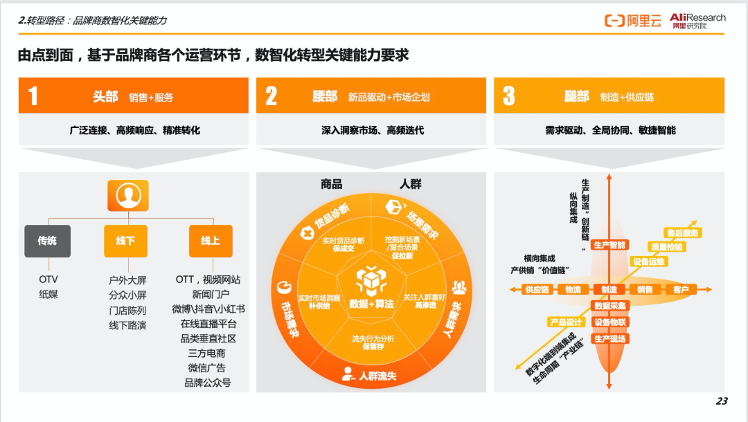 近年来持续崛起的消费者主权,被疫情进一步放大,新客、新品、新场景、新运营现象级爆发,面对巨大的细分品类增量市场,数字化正引领新一代的品牌化发展浪潮。中国连锁经营协会秘书长彭建真表示,当前零售业正在经历着一场伟大的数字化变革,云计算、大数据、人工智能等日新月异的新技术正在重塑零售行业新格局。作为零售业重要的参与主体--品牌商尤其是传统品牌商,正在抓住数智化浪潮的新机遇。阿里云智能零售行业总经理戴涛认为,对于广大泛零售的消费品行业而言,需要回归商业本质去思考如何在确定性的趋势下,通过数字化技术去推动企业的数字化转型,以更好地构建全新组织能力,进行数字化变革,并在可持续经营道路上迈出坚实的步伐。阿里研究院数字经济中心主任安琳从宏观经济和企业微观经营两方面进行深度解读,推导出品牌商增长的破局之道。宏观经济数字表明,中国消费支出的结构持续分化,消费升级伴随着需求细分。到2025年,我国消费增长的动力主要来自四个方面:人口升级、城镇化、数字设施升级、政策驱动;微观层面,企业所面临的需求态势已经发生了不可逆的革命性变化。品牌正在重新定义竞争优势:如何精准且迅速满足客户需求。中国连锁经营协会(CCFA)、阿里云智能零售行业、阿里研究院历时3个月,基于20余个品牌数智化转型升级案例,从建渠道、深运营、修内功、做融合、创模式5个关键业务举措出发,由点到面,基于品牌商各个运营环节数智化转型关键能力,详解他们如何在业务变革过程中逐步构建数字化能力,实现业务增长和商业模式的升级。《白皮书》聚焦市场与企划、销售、服务、供应链、制造、财务与内控6个品牌数智化关键环节,覆盖28个核心场景,包含20个客户最佳实践。内容从护航新锐品牌可持续增长、帮助传统品牌创新升级、助力品牌在新品、新客、新场景中占得先机到支持企业在经营成本效率上精益求精,为广大品牌商的数智化转型升级提供战略思考和实践参考。2022年国际环境、政策因素、市场竞争、疫情发展仍有诸多不确定性,品牌商群体需要共同“磨砺以须,倍道而进”,借助数字化的加持共谋高质量的增长。
