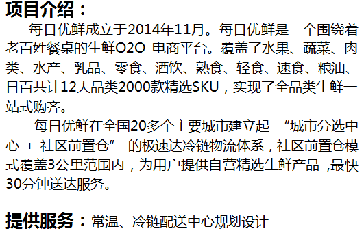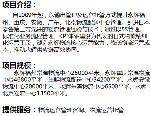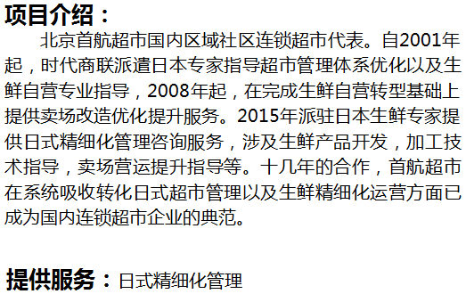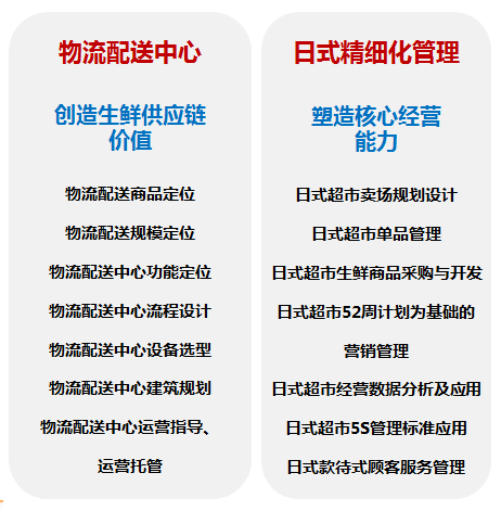 国内率先提出生鲜一体化咨询服务,助力行业生鲜核心能力塑造;与首航开展日式生鲜精细化管理提升服务;与永辉合作开展物流运营托管服务与超市发、首航、新华都、北国商城等企业合作改造提升门店生鲜经营探索实践新零售背景下的生鲜-冷链-物流一体化咨询服务,为客户创造价值
