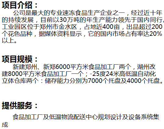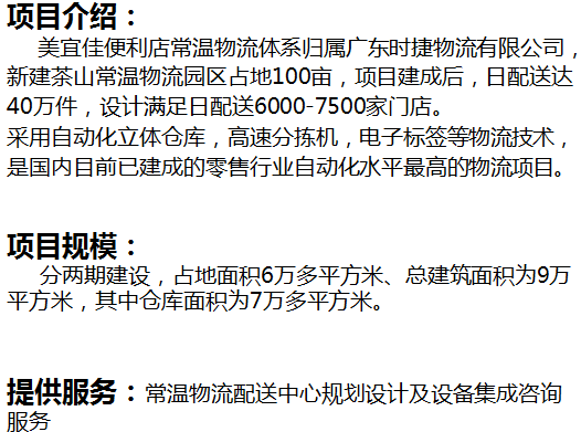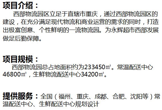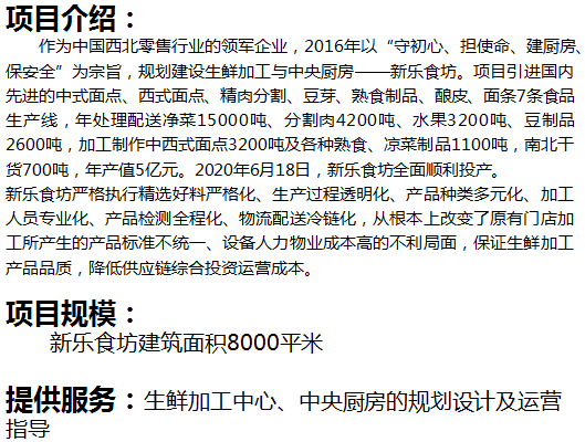 与家家悦携手打造超市行业第一家高标准的生鲜加工配送中心;与永辉结成战略合作,规划建设高效率的物流配送中心.在为伊藤洋华堂、永旺提供店铺设计的基础上,开展商业设计咨询服务,助力首航、明珠、华冠、中百等多家企业门店运营提升与永辉、家家悦、步步高、中百、美宜佳等40多家连锁百强企业结为战略合作伙伴,提供生鲜加工与中央厨房、物流配送中心规划建设、运营管理咨询服务;