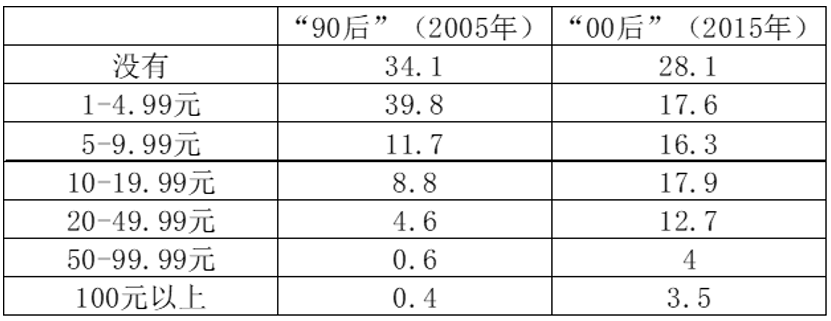 数据来源:“中国少年儿童发展状况”调查,其中“90后”数据来自2005年调查结果,“00后”数据来自2015年调查结果