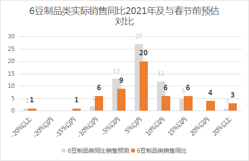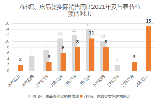 6、豆制品类(豆腐、豆浆、豆制品深加工)表现良好,销售同比2021年增长20%以上的有3家,增长15-20%的有4家,增长10-15%的有6家,增长5-10%的有6家,增长5%以内的有20家,只有17家同比下降。豆制品本身自带健康标签,符合大部分消费者的饮食习惯,另外,越来越多的零售企业自己加工豆制品,质量和数量都有保障。7、针织床品类(保暖内衣、睡衣睡裤、袜类、拖鞋、毛巾、床上用品、休闲鞋及服装、婴儿用品)的表现出乎意料,销售同比2021年增长20%以上的有15家,增长15-20%的有3家,增长5-10%的有8家,增长5%以内的有11家,只有19家同比下降。针织床品类销售同比提升的主要原因是春节前后我国大部分地区气温较2021年降低了很多,线上购物有一定的配送时长,因此进店选购成为消费者首选,当然也离不开零售企业事先精心的选品备货。