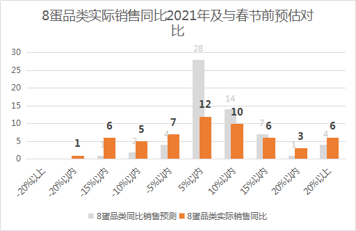 8、蛋品类(鲜蛋、加工蛋品)的表现也不错,销售同比2021年增长20%以上的有6家,增长15-20%的有3家,增长10-15%的有6家,增长5-10%的有10家,增长5%以内的有12家,只有19家同比下降。蛋品类一向销售稳定,春节前后我国部分地区有降雪,对物流运输产生了不利影响,对零售企业备货是个考验,供应链基础扎实的零售企业才能保证品种齐全。