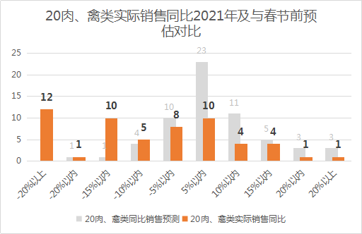 20、肉禽类(猪、牛、羊、禽、其他肉类,调理肉类半成品0-4度、速冻禽类、速冻肉类)的表现大大低于预期,销售同比2021年下降20%以上的有12家,下降15-20%的有1家,下降10-15%的有10家,下降5-10%的有5家,下降5%以内的有8家,有20家同比增长。肉禽类今年春节表现不如去年,主要原因是猪肉售价同比去年下降50%左右。感谢全国的连锁零售企业春节期间的辛勤付出,保障全国人民度过了一个幸福祥和的春节!