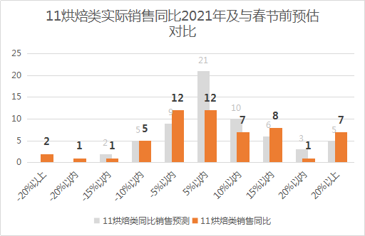 11、烘焙类(面包、中西糕点)的表现略好,销售同比2021年增长20%以上的有7家,增长15-20%的有1家,增长10-15%的有8家,增长5-10%的有7家,增长5%以内的有12家,有21家同比下降。