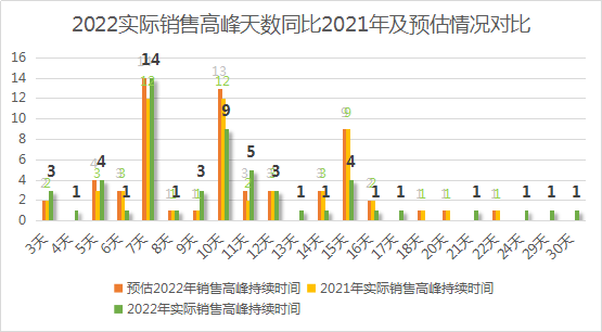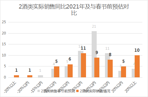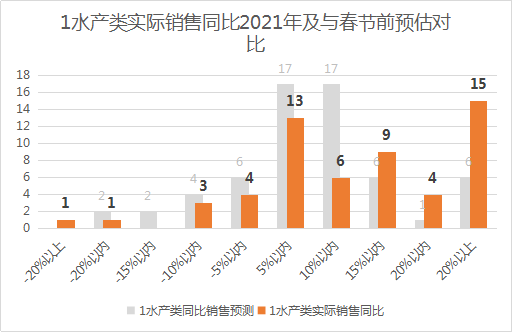 大多数零售企业从1月21日(农历腊月十九)才开始陆续进入销售高峰,最晚开始的是除夕当天才进入销售高峰。疫情、就地过年政策、地方风俗对春节销售高峰起始时间均有影响。多数零售企业销售高峰在5-15天之间,其中有4家企业超过21天。节前宣传、店内布置、商品结构、服务及营销方案等方面对销售高峰持续天数起关键作用。20个大分类实际销售各商品分类表现不一,和预期相比差距较大的品类中,超出预期的主要有水产、酒类、休闲食品、水果、冷冻食品、豆制品、针织床品等分类,不如预期的主要有肉禽、清洁美容和洗涤纸巾等分类。具体表现如下。1、水产类(鲜活水产、冰鲜水产、称重冷冻水产、联营水产、速冻水产)表现最好,销售同比2021年增长20%以上的有15家,增长15-20%的有4家,增长10-15%的有9家,增长5-10%的有6家,增长5%以内的有13家,只有9家同比下降。虽然进口水产受疫情影响,但是国产冷冻水产在标识、品相、包装方面大幅提升,加上淡水活鲜品种丰富、消费者健康消费观念的逐步树立,所以水产类销售表现良好。2、酒类(白酒、啤酒、红酒)表现良好,销售同比2021年增长20%以上的有10家,增长15-20%的有5家,增长10-15%的有8家,增长5-10%的有9家,增长5%以内的有11家,只有13家同比下降。春节期间聚会、走亲访友都是酒类商品的消费场景,加上消费者对中高端酒类的需求提升,备货充足,促成了酒类销售提升。3、休闲食品(坚果炒货、果脯蜜饯、肉干、豆干、糖果、果冻)表现良好,销售同比2021年增长20%以上的有6家,增长15-20%的有5家,增长10-15%的有9家,增长5-10%的有15家,增长5%以内的有8家,只有13家同比下降。休闲食品一向是春节期间的重点商品,且自带健康标签,深受广大消费者特别是年轻消费者的喜爱,散称、礼盒、团购各方面销售都不错。