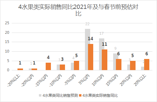 4、水果类(苹果、梨、桃李杏、柑橘、瓜果、浆果、热带类、坚果类、其他水果、水果礼盒)的表现良好,销售同比2021年增长20%以上的有6家,增长15-20%的有5家,增长10-15%的有6家,增长5-10%的有11家,增长5%以内的有14家,有24家同比下降。水果类商品同比上升的企业在卖场陈列、礼盒、大单品打造方面准备得充分。