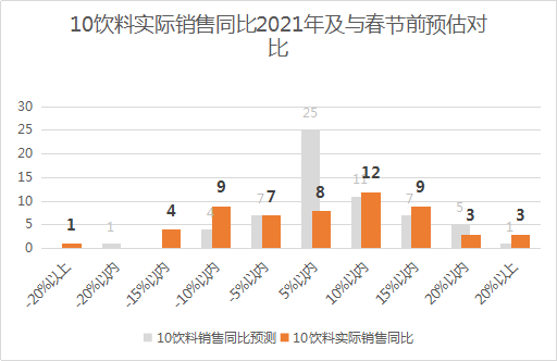 9、方便食品(饼干、曲奇、派类、冲调食品、保健品、方便餐、巧克力、婴儿食品)的表现也不错,销售同比2021年增长20%以上的有4家,增长15-20%的有7家,增长10-15%的有5家,增长5-10%的有8家,增长5%以内的有12家,只有20家同比下降。新品引进和备货数量是决定方便食品销售的关键因素,同比下降的企业大多是因为缺货和新品引进不足。10、饮料(瓶装水、功能饮料、茶饮、果蔬饮料、碳酸饮料、含乳饮料、冲饮、咖啡)的表现略好,销售同比2021年增长20%以上的有3家,增长15-20%的有3家,增长10-15%的有9家,增长5-10%的有12家,增长5%以内的有8家,有21家同比下降。