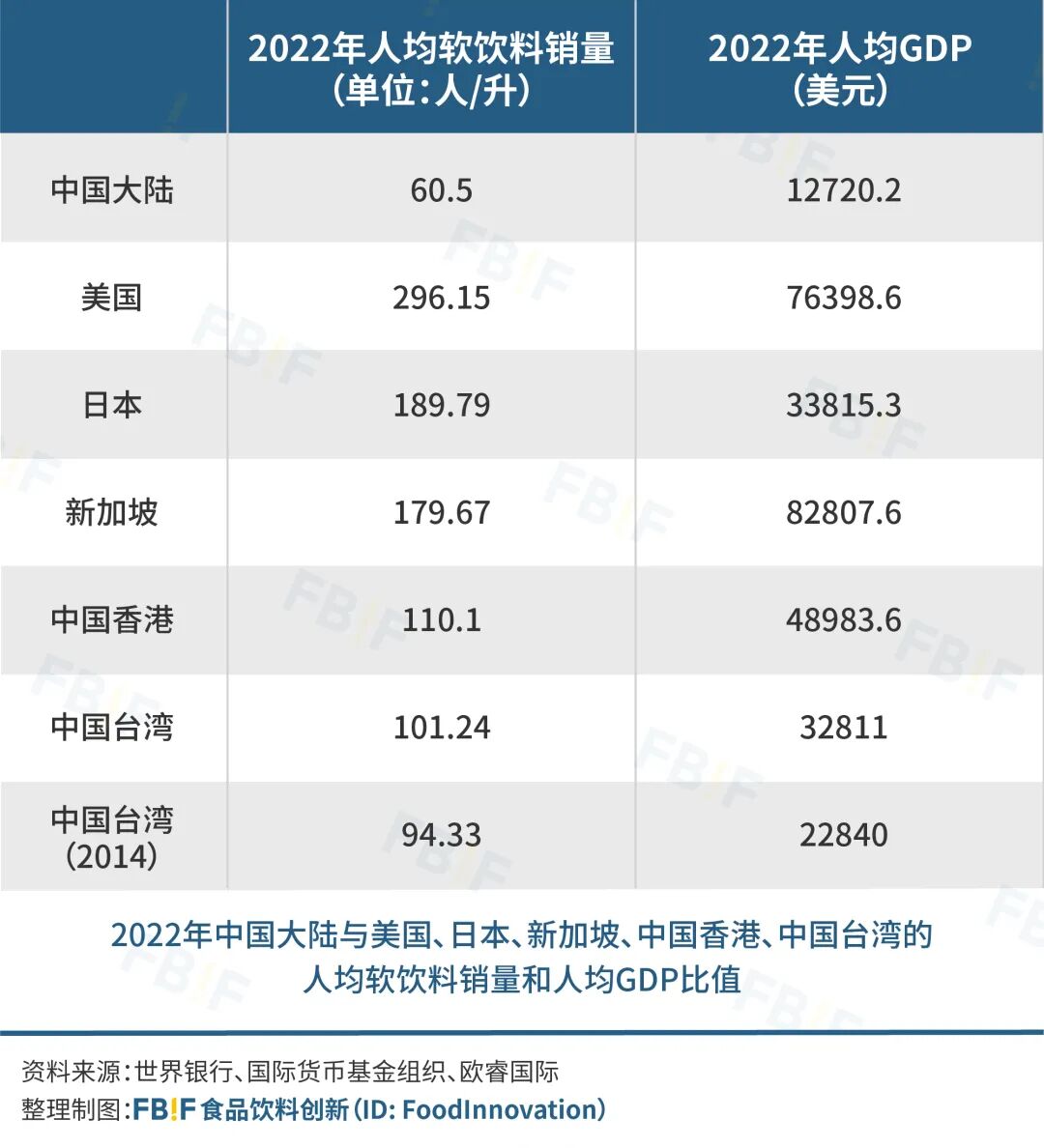 我们预测未来10年中国人均软饮料销量将增长33.88%,这意味着中国饮料市场在目前5831.59亿市场规模(欧睿国际)的基础上增长1/3,拥有近2000亿的增长潜力。2012到2022年,中国人均GDP增长了101.9%,达到了12720.2美元,人均饮料销量增长了44.98%,从41.73升/人增长到60.5升/人(欧睿国际)。而根据IMF预测,2028年中国人均GDP将达到16800美元,2023-2028年均复合增长率为6.02%,如果保持这个增速,2032年中国人均GDP将达到22482.19美元。[36] 以2012-2022年的人均GDP增长带动人均软饮料销量增长的比值计算,2032年中国人均软饮料销量预期将增长33.88%,达到81升/人。横向对比发达国家和地区市场,2022年中国大陆人均软饮料销量是60.5升/人,美国、日本、新加坡、中国香港、中国台湾等国家或地区的人均软饮料销量分别是296.15、189.79、179.67、110.1、101.24升/人。[37]我们以中国台湾地区作比较,2014年的人均GDP为22840美元,而当年的人均软饮料销售量达到了94.33升/人,贴近前述的81升/人的增长预期。2022年中国大陆与美国、日本、新加坡、中国香港、中国台湾的