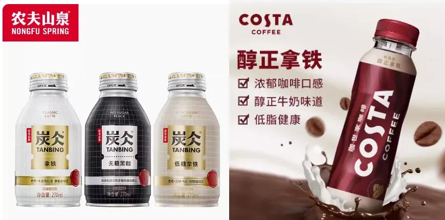 1998年,速溶咖啡巨头雀巢将即饮咖啡从日本引入中国,随后星巴克、三得利等外资品牌进入,推出亲民价格产品,引发行业首次扩张。多年来即饮咖啡未见大规模增长,2020年其在中国软饮料市场的占比不足2%(欧睿国际)。然而,市场正在改变,近五年即饮咖啡却是饮料市场少数实现高速增长的品类之一。根据头豹发布的2022中国即饮咖啡行业概览数据,2017年-2021年,中国即饮咖啡市场以19.3%的复合增长率实现市场规模翻倍,达到96.4亿人民币。[32]近年来现制咖啡市场的爆发式增长更是带动了即饮咖啡市场的上升,尤其是星巴克、瑞幸、Tims天好中国等现制咖啡店面的铺开普及了咖啡文化。据美团数据,2023年中国连锁咖啡店总数达到32,844家。[33] 日常生活中,即饮咖啡相比现制咖啡更具有便捷性,相比普通饮料有显著的提神功能,满足了职场人士、学生群体、户外活动和旅行群体的需求。此外,即饮咖啡市场的集中度常年较高,2020年的行业前两大公司占据了64%的市场份额。雀巢和星巴克作为长期在中国即饮咖啡领域的领头品牌,市场鲜有“新起之秀”。不过近几年,即饮咖啡市场吸引了越来越多的“参赛者”加入了这场激烈的角逐。比如,农夫山泉的炭仌一上市就迅速成为话题焦点,可口可乐中国也携COSTA即饮咖啡加入战局。新兴消费咖啡品牌也都陆续进军该市场:如Tims天好咖啡与OATLY合作推出即饮燕麦拿铁、菲诺推出生椰拿铁等。[34]![]()