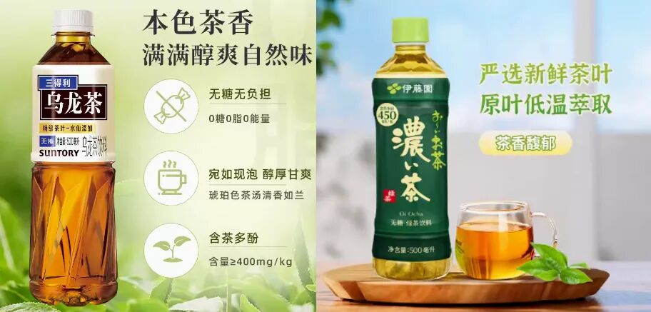 以农夫山泉东方树叶、三得利乌龙茶为代表的无糖茶已成为即饮茶品类的新增长点,正在推动该品类的整体增长。[2] 此外,与其他国家相比,2022年中国即饮茶的无糖化率仅为7.7%,远低于韩国(96.1%)、日本(85.2%)、马来西亚(47.1%),并且日本的人均即饮茶消费量约为中国的六倍。[8] 这意味着,中国即饮茶市场,尤其是无糖茶赛道还存在着较大的增长空间。