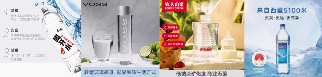 康师傅熟水、VOSS高端水、农夫山泉母婴水、5100低氘水产品图