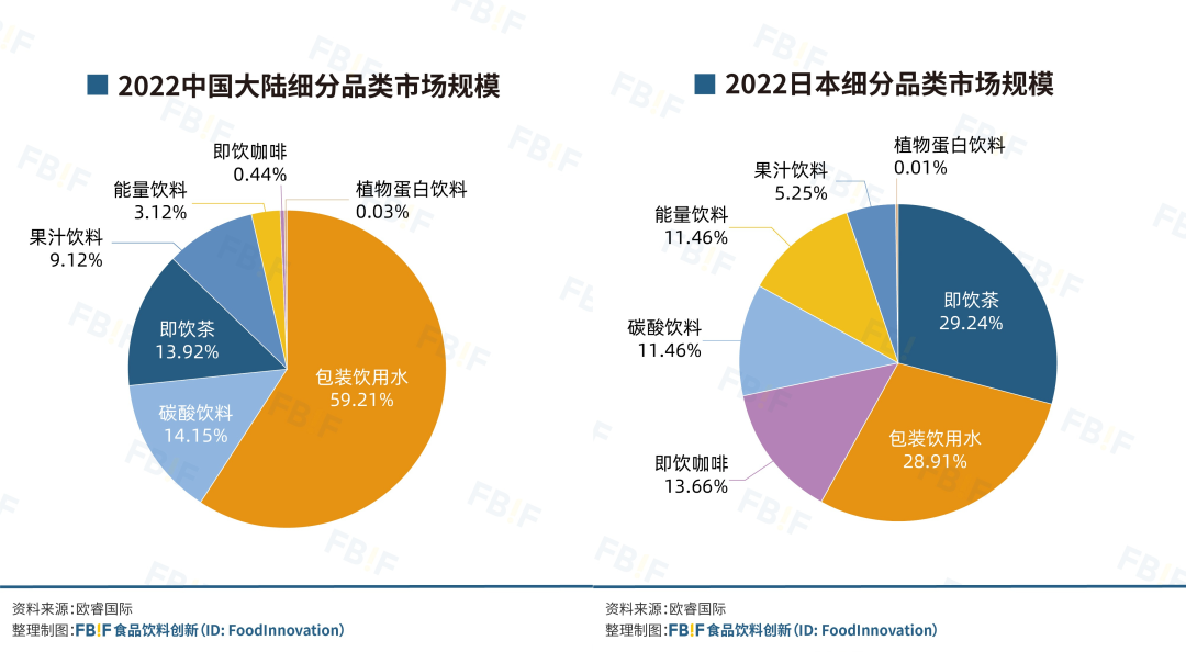 2022年中国大陆、中国香港、中国台湾和日本饮料细分品类市场占比图