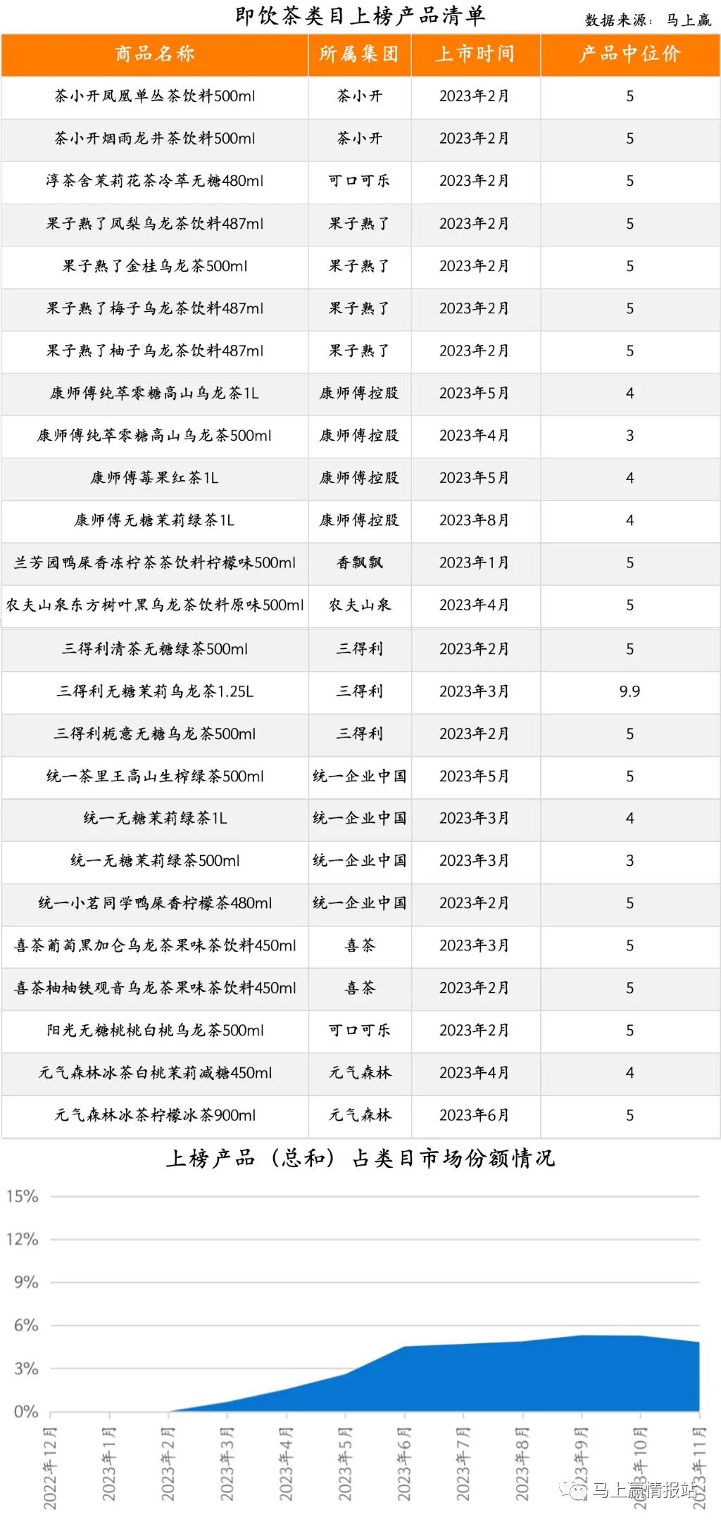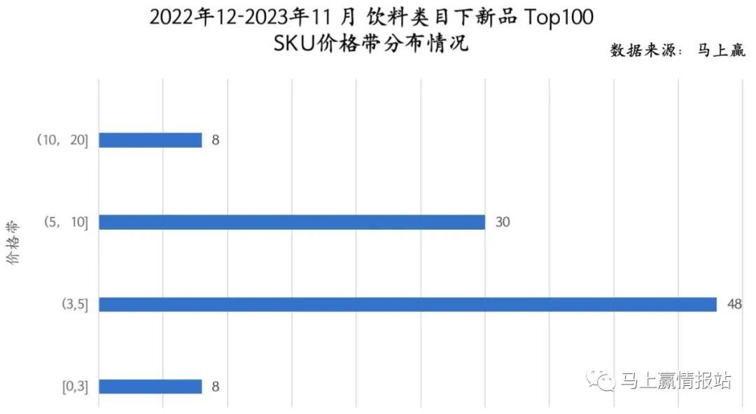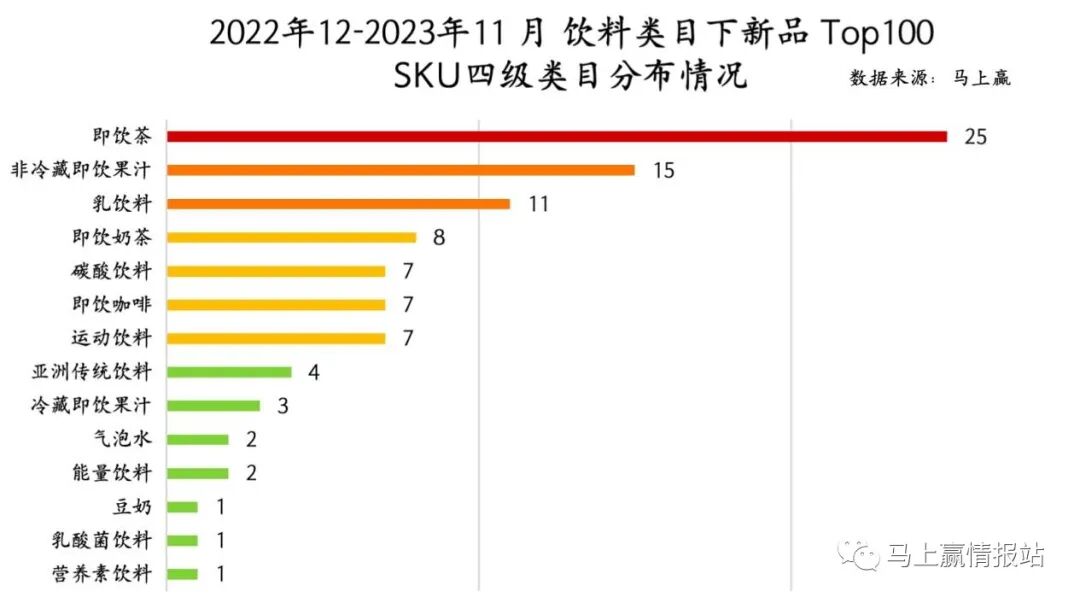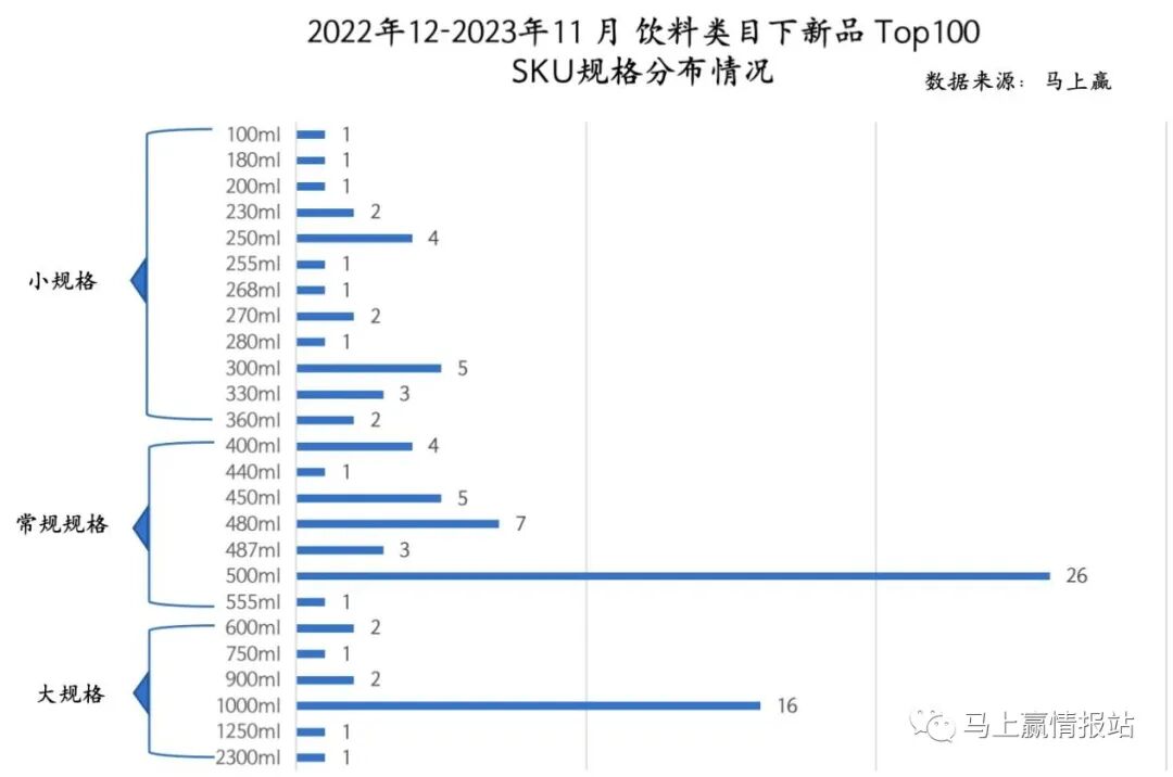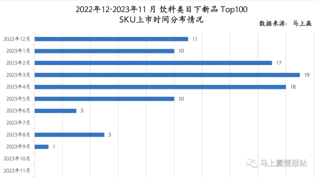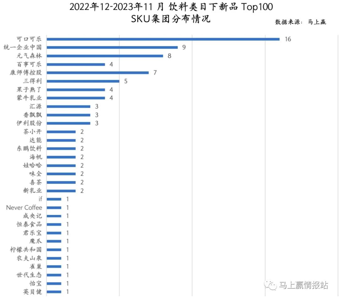 2023年作为消费市场回暖的第一年,各个品类内的产品创新与集团竞争也重新回到了“快车道”。饮料市场近一年的发展有什么产品上的创新与变化?在风云变幻中,哪些品牌乘势而起,哪些品牌屹立不倒?基于马上赢线下零售监测网络中的数据,我们将在本周与下周,对饮料市场近一年(2022.12-2023.11)的新品表现情况和热点类目集团格局进行盘点。本周,我们将对2022年12月-2023年11月期间内上市的饮料新品SKU进行销售额排序,并取前100个SKU进行分类目,分市场份额,分产品特点的梳理与盘点。下周则会对热点类目的集团格局与类目亮点进行盘点。- 盘点产品上新时间并不相同,因此盘点中上榜SKU存在上市时间长销售额高、上市时间短销售额低的客观情况,盘点更多希望将各类目中的新品SKU展示出来,不以产品间/类目间的实际销售情况与规模对比为目的;