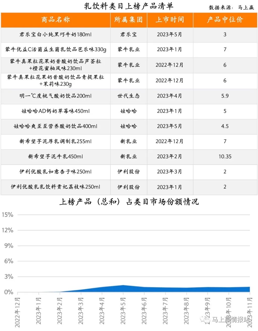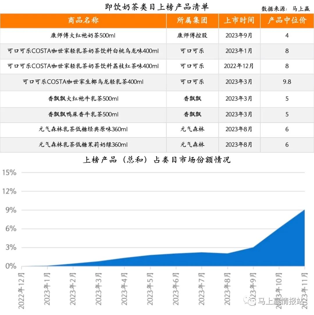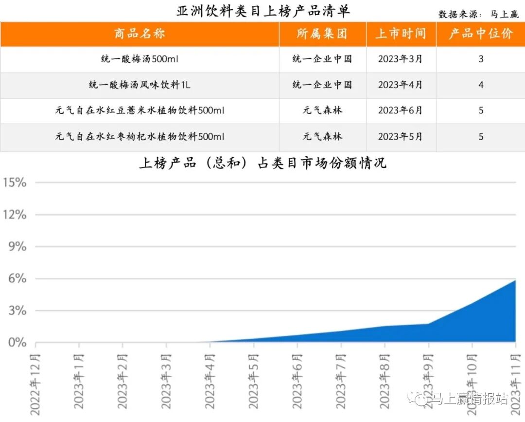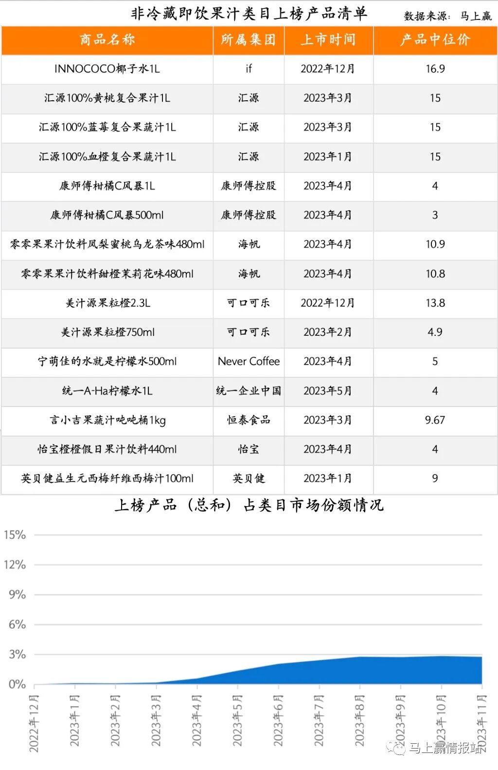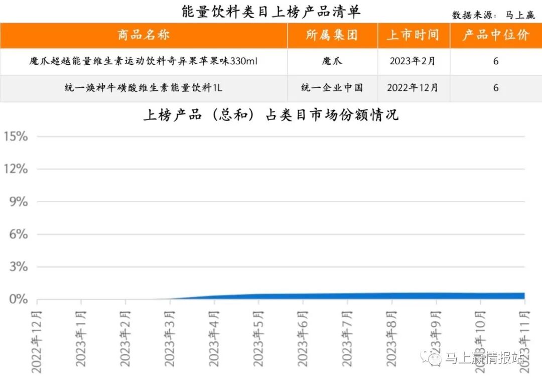 2023年作为消费市场回暖的第一年,各个品类内的产品创新与集团竞争也重新回到了“快车道”。饮料市场近一年的发展有什么产品上的创新与变化?在风云变幻中,哪些品牌乘势而起,哪些品牌屹立不倒?基于马上赢线下零售监测网络中的数据,我们将在本周与下周,对饮料市场近一年(2022.12-2023.11)的新品表现情况和热点类目集团格局进行盘点。本周,我们将对2022年12月-2023年11月期间内上市的饮料新品SKU进行销售额排序,并取前100个SKU进行分类目,分市场份额,分产品特点的梳理与盘点。下周则会对热点类目的集团格局与类目亮点进行盘点。- 盘点产品上新时间并不相同,因此盘点中上榜SKU存在上市时间长销售额高、上市时间短销售额低的客观情况,盘点更多希望将各类目中的新品SKU展示出来,不以产品间/类目间的实际销售情况与规模对比为目的;