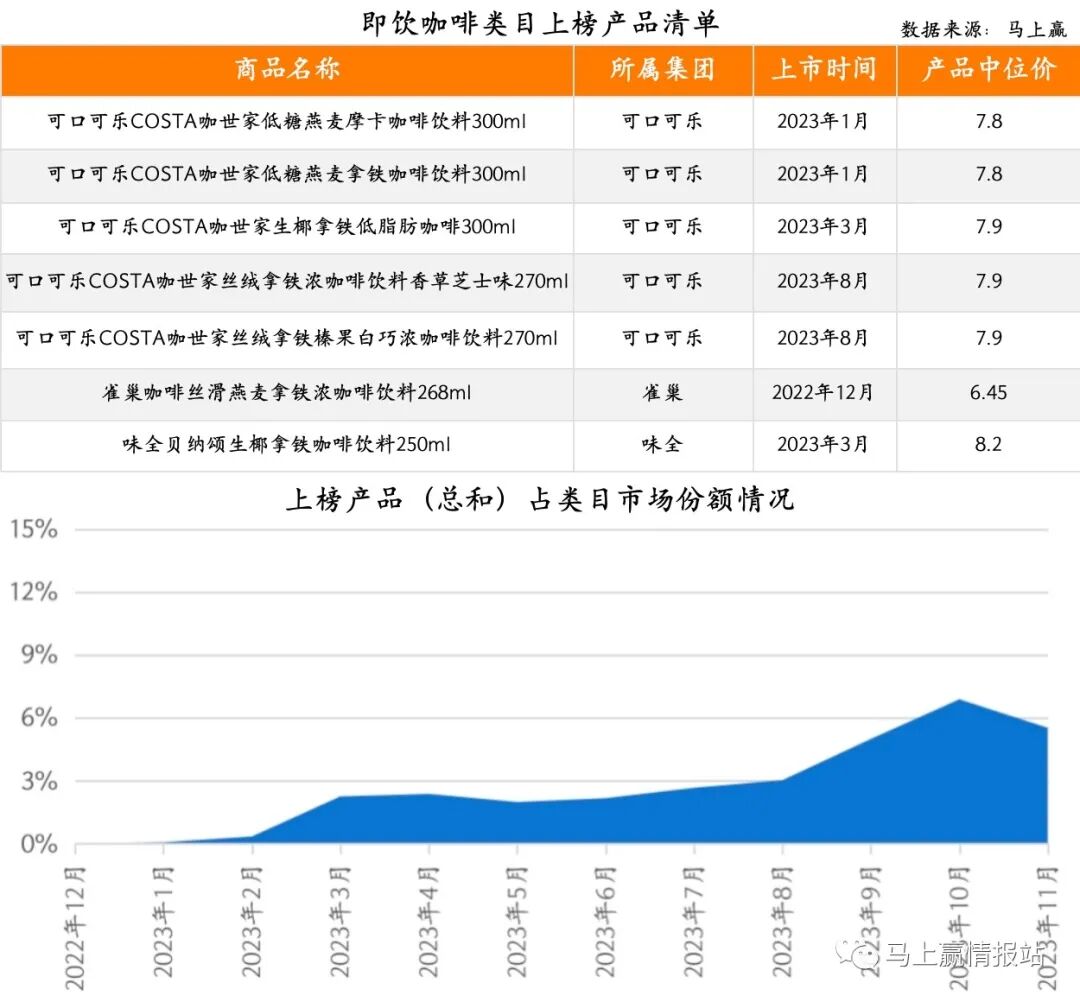 第三梯队:即饮咖啡、即饮奶茶、运动饮料、碳酸饮料类目相比第二梯队的各类目,第三梯队的即饮咖啡、即饮奶茶、运动饮料上榜新品数量大都在6-7个产品。在即饮咖啡类目中,可口可乐今年的COSTA咖世家系列产品取得了非常好的表现,该系列产品在中国区取得的优秀成绩曾被可口可乐公司CEO在今年第三季度财报业绩会议上“点名表扬”,从新品数据上看确实所言非虚。在即饮咖啡类目上榜的七款新品中,有五款产品来自可口可乐咖世家系列,产品类型为拿铁和摩卡,包括低糖款和常规款产品,亦包含坚果、椰子、香草等组成的混合口味。除咖世家系列外,雀巢、味全分别有一款产品上榜。