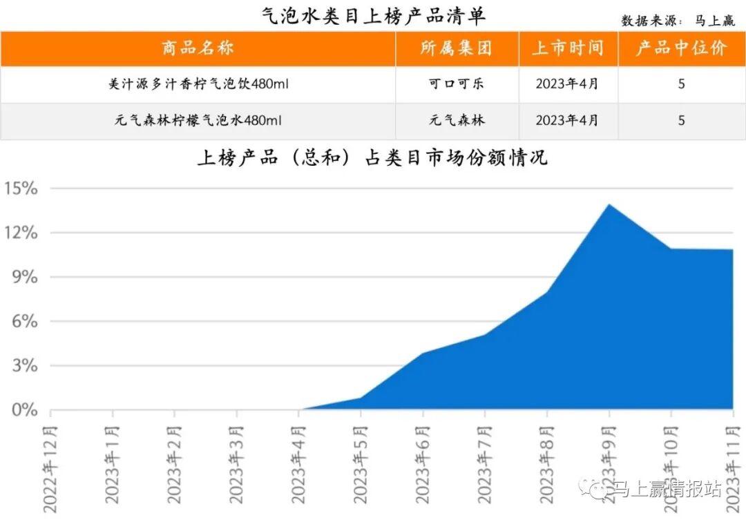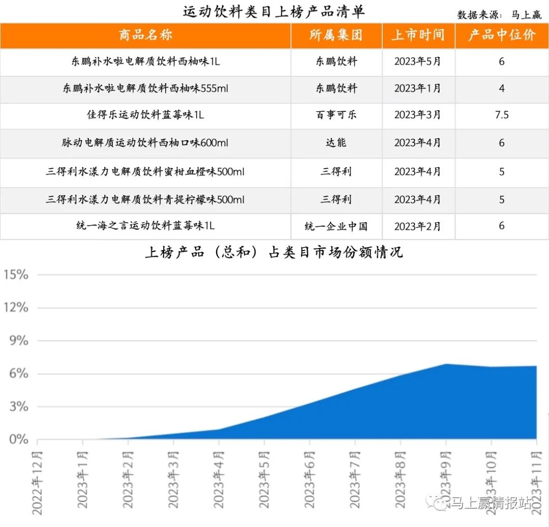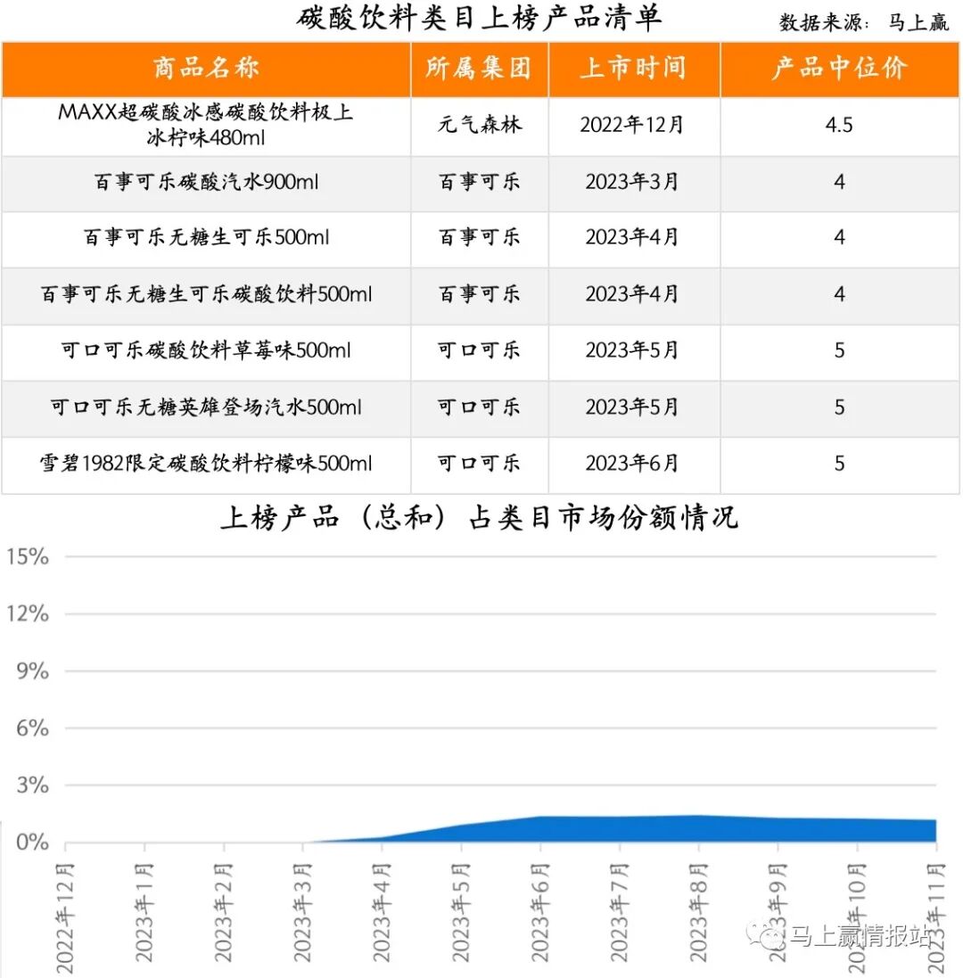 从新品的类目市场份额占比上也能看到以咖世家为代表的新品系列在类目中的发展趋势。可以看到,2023年2月新品的增长就已启动,并在夏季基本维持在类目份额占比2%-3%的区间内。由于即饮咖啡有较强的热饮适配性,8月、9月随着全国各地气温转凉,类目新品份额占比又迎来了一个新的高峰,并在10月时达到峰值6%以上的份额占比。11月虽然有所回落,但也维持在5%以上。虽然咖世家系列在下一年度不再是“新品”,但其强势的市场表现仍值得期待。在即饮奶茶类目中,可口可乐咖世家系列同样以三款产品位列榜首,产品类型均为轻乳茶,以果+茶+奶为产品的核心构成元素。香飘飘、元气森林分别以牛乳茶与元气森林新乳茶上榜,其中元气森林乳茶在今年的焕新后,不但在产品价格带上由原来10元左右的价格带下调至6元左右的价格带,且产品全系列调整为低糖配方,经过产品与价格带的调整后的元气森林乳茶也取得了较好的成绩。除此以外,康师傅以一款大红袍奶茶新品上榜。 新品在类目市场份额占比上,与即饮咖啡类似,即饮奶茶类目的新品在夏季基本维持在2%左右的新品市场份额占比,且由于热饮适配性的原因,在9月起迎来了快速的增长。截止2023年11月,新品所占类目的市场份额已达到9%左右,在类目中已经形成了一定的规模,对类目的传统格局也形成了一些改变,让人期待新品在今年冬天后续几个月的表现情况。在运动饮料类目中,最火的概念依然是电解质产品,上榜产品也基本为电解质概念相关产品。其中,东鹏、三得利各有两款产品上榜,分别是东鹏今年新推出的电解质饮料系列产品东鹏补水啦,以及三得利的水漾力电解质系列产品;佳得乐、海之言则是两款1L装的大规格产品上榜。相比之下,脉动的电解质饮料在今年推出后,市场反馈比较一般,上榜产品也只有西柚口味一个口味的电解质运动饮料产品。 在上榜新品占据类目的市场份额上,新品从2、3月左右启动,在4-8月的夏季中得到了一个长足的增长,并在9月达到了6%以上市场份额的峰值。值得注意的是,9月-11月,新品的份额并没有显著的下降,可见在运动饮料中,以电解质概念为主的类目新品的功效功能性心智越来越强,受到季节的影响也低于传统的夏季冰饮。在碳酸饮料类目上榜新品中,两乐依然在上榜新品数量上占据绝对优势,分别各有三款产品上榜。其中可口可乐以草莓味、英雄联盟联名限定口味、以及雪碧的1982复古口味上榜,均为传统可乐、雪碧产品线的新口味延伸。百事则是以今年新上市的无糖产品线“生可乐”系列,以及传统可乐的900ml大规格产品上榜。另一个上榜的是归属于元气森林集团的MAXX超碳酸饮料,这款产品以超刺激、超冰感为核心卖点,在较为传统、固化的碳酸饮料类目中占据了一席之地。 从新品占有类目的市场份额上看,新品集中上市时间为5-6月,峰值不足2%,整体类目格局较为传统,固化,新品成长空间不大。其他类目:亚洲传统饮料、冷藏即饮果汁、气泡水、能量饮料、豆奶、乳酸菌饮料、营养素饮料及其他不同于前面第一、第二、第三梯队中较为蓬勃的新品。在冷藏即饮果汁类目、气泡水类目、豆奶类目、亚洲传统饮料类目中,新品基本都基于旧有产品的局部创新,或还处于较早期的阶段。虽然新品在类目中的占比都获得了峰值3%-15%的类目占比,但是首先几个类目中进入top100的sku数量较少,基本只有1-4款;其次,基本为旧有产品的规格或口味上的延展,基本没有各集团在新产品线或新功能点方面上的布局;