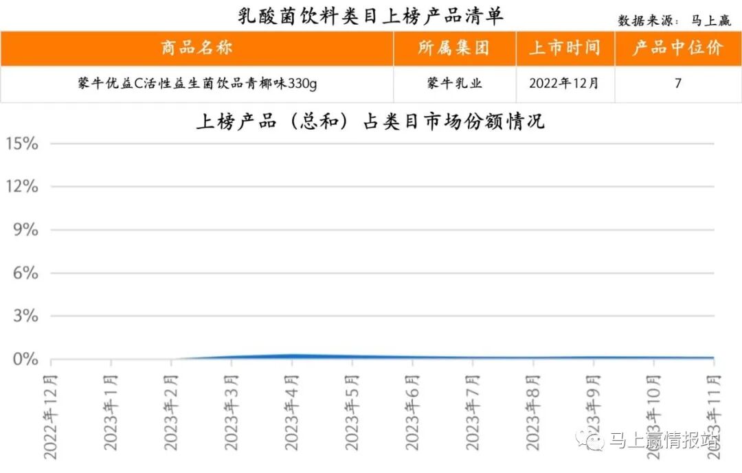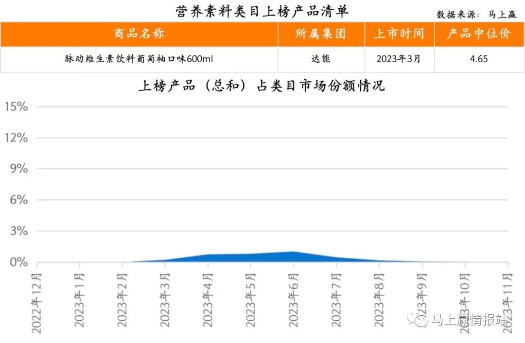 通过几个类目的新品情况可以看到,柠檬共和国在果汁+气泡的冷藏即饮果汁产品形态上的创新,在产品上市后取得了较好的成绩。元气森林的柠檬味气泡水作为其大单品气泡水的最新口味延伸,上市后也有很不错的表现,与美汁源的柠檬味气泡产品一起在类目内取得了峰值近15%的好成绩,并有较好的持续性。另一个值得关注的点是元气森林今年在亚洲传统饮料类目中,以红豆、红枣、薏米、枸杞等植物概念为原料核心进行创新的元气自在水系列产品,由于其还具有一定的热饮适配性,因此在9月-11月依然推动新品份额在类目中的占比处于上涨通道中。在能量饮料、乳酸菌饮料、营养素饮料几个类目中,年度内均未跑出成规模的新品,几个类目新品上榜数量均为1-2款,整体上榜的新品数量很少;另一方面,新品在年内的表现也均较为平稳,几款新品在所在类目中的市场份额占比峰值均在1%左右,对类目格局的影响很小;基于本周对于新品的盘点,我们看到了在近一年中,规模以上新品的分布与创新情况。在下周,我们将会对几个热点类目的现有集团格局,以及近一年市场与类目中的集团、产品亮点进行盘点,敬请持续关注!数读「英贝健」:果饮披上功效“外衣”,能跑出新赛道?