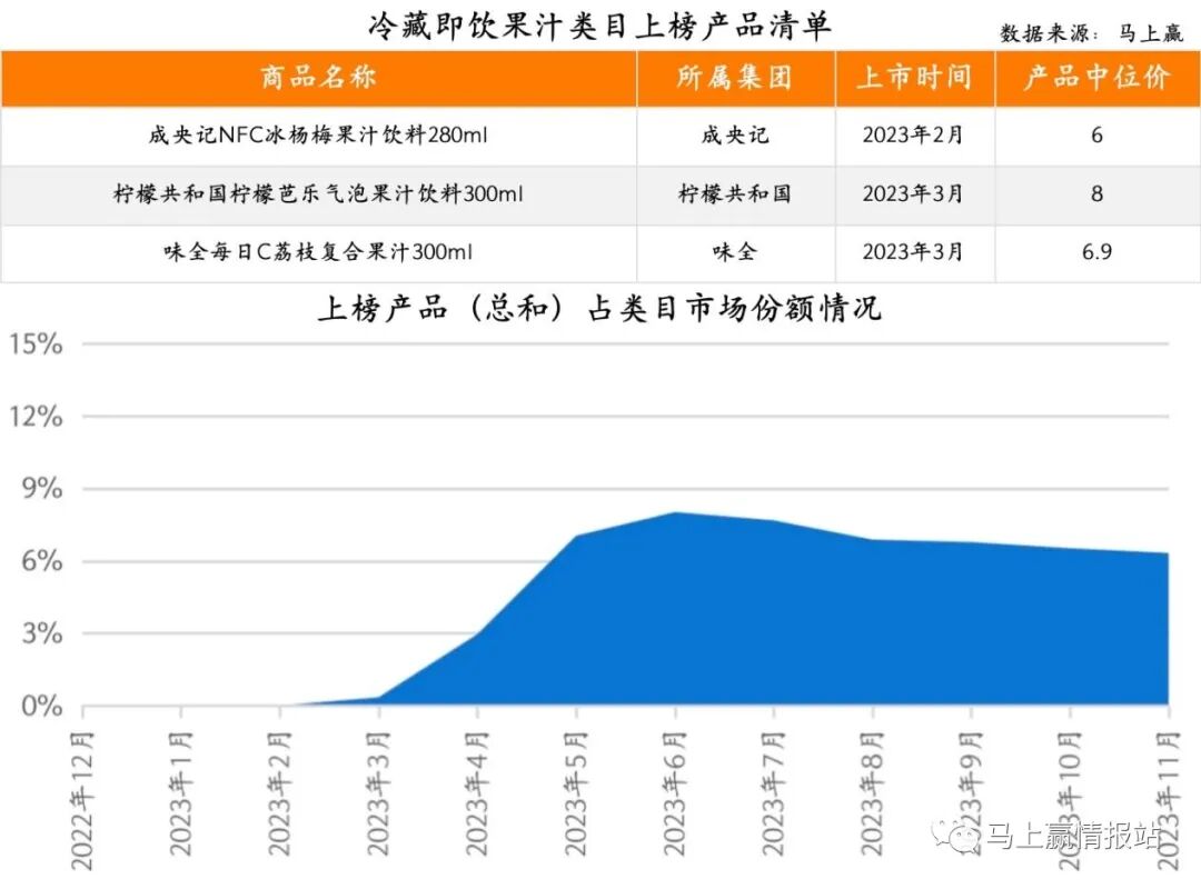 从各类目的上榜新品分布上来看,年度最火热的新品类目无疑是即饮茶。即饮茶以25款上榜产品的数量名列第一,意味着即饮茶无论是在产品创新数量上,还是创新产品的表现与活跃程度上,都处于绝对领先的位置。非冷藏即饮果汁、乳饮料处于第二梯队的位置,上榜产品数量为15、11款新品,创新产品较多、且有一定活跃程度。第三梯队由即饮咖啡、即饮奶茶、运动饮料、碳酸饮料类目组成,上榜新品数量在7、8左右。其余类目则在创新产品数量与新品活跃程度上表现较普通。 从规格维度看,在TOP100的新品中,400~555mL的SKU数量达到了总数一半,达到了47个,其中500mL占据了绝对优势。其次在100~360mL的小规格包装范畴内,有24个SKU,相对应的600~2300mL的大规格包装新品也有23个。尽管从数量上看,大小规格差异不大,但细看其分布则大有不同。由图可见,大规格的新品大部分均为1000mL,但小规格的规格集中度更低,仅250mL的变动范围内,竟有12种不同规格,相较于常规规格和大规格,小规格产品呈现出了更强多样性和可能性。 而以集团角度来看,可口可乐仍然保有优越的创新活力,近一年的时间成功推出了16款TOP100的新品,包括像COSTA咖世家这种取得优秀成绩的系列新品。统一、元气森林、百事可乐和康师傅等企业,在新品推出上持续发力,凭借着多赛道布局,也有不错表现。而if、英贝健等企业则依托单一产品的爆火顺利上榜。在 2023 年的饮品创新中,可以看到,规模以上创新对于传统饮料品牌意愿和吸引力更强,传统饮料品牌对于新陈代谢有自身的节奏,也有更加可行、稳定的机制。从年度top100的新品价格带分布上来看,由于包含大规格产品,因此在5元以上的高价格带中依然有相当数量的产品。消费者对于饮料产品接纳的价格带还是在3-10元区间。相比前几年新消费浪潮下屡屡创新高的“高价产品”,2023年的高价产品更难跑出规模,10-20元价格带中上榜的新品只有8个,只占整体100个SKU的10%不到。同时,受限于原材料、劳动力成本以及渠道成本的上涨,在3元以下价格带的产品数量也只有8个,占比也不到10%。从年度top100的新品上市时间上看,大部分新品都选择了在上半年上市,并集中在2-4月之间,意图上更多是为了赶上即将到来的夏季,也是传统意义上的饮料销售旺季。在7月-11月,上新的产品大都为有较好热饮饮用特性的产品,例如即饮奶茶、适合热饮的茶与植物饮料、亚洲传统饮料、以及即饮咖啡等,为即将到来冬天的热饮零售市场做准备。在年度新品第一梯队的即饮茶类目中,各家有成熟即饮茶产品的集团均有新品上榜。果子熟了、康师傅、统一三个集团在即饮茶方面的创新在今年都取得了较好的成绩,分别有4款产品进入榜单。果子熟了在即饮茶类目新品上榜集团中与康师傅、统一并列位于榜首,作为相对而言的“新锐”品牌,其显现出了在产品创新、产品运营上的实力,从一众传统玩家中脱颖而出实属不易。三得利有3款产品进入榜单,可口可乐、喜茶、茶小开、元气森林则分别有2款产品进入上榜产品清单中。 另一个可以看到的点是,虽然即饮茶中的无糖/无甜产品在今年风头最盛,可在新品上榜清单中依然有大量有糖产品,例如传统上较为成熟的柠檬茶、果茶等。无糖无甜产品盛行之下,有糖产品的改善也依然被消费者重视,被品牌关注。在未来无糖无甜即饮茶风潮趋于平缓后,传统冰红茶、果茶等高糖产品的改善或将成为类目未来的增长点之一。从新品份额上来看,上榜新品大都在2、3月份上市,并在夏季达到新品成长高峰。可以看到年度新品在即饮茶类目中的市场份额(总和)在6月饮料市场刚进入旺季时就稳定在5%左右,并一直持续到11月,新品整体的活跃程度较高,给类目整体带来了质量很好的“新鲜血液”。在第二梯队中,首先也是今年的热点类目之一,非冷藏即饮果汁类目的新品上榜情况。从集团角度看,汇源在该类目的新品上榜数量最多,有三款产品上榜,均为100%的复合果汁类产品,且均为大规格产品。其次是有两款新品上榜的可口可乐、康师傅,康师傅凭借创新的维生素C概念产品柑橘C风暴的大规格和中规格上榜,可口可乐则是凭借果粒橙的新规格切分上榜,在规格上提供多样化选择也是消费者近年来的需求趋势之一。其次上榜集团包括海帆的复合果汁、IF的规格焕新椰子水、Never Coffee、统一的两款柠檬水,以及恒泰、怡宝的产品等。上周我们曾介绍过的英贝健西梅汁100ml则作为唯一一个西梅口味新品上榜。