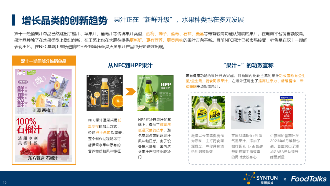 双十一热销果汁单品已然跳出了橙汁、苹果汁、葡萄汁等传统果汁类型,西梅、椰子、蓝莓、石榴、桑葚等带有较高功能认知度的果汁,在电商平台销售额较高。果汁品牌除了在水果类型上做出创新,在工艺上也在大胆往提供更新鲜、更有营养、更具风味的果汁方向革新。目前NFC果汁已被市场接受,销售量在双十一期间表现出色,在NFC基础上有所进阶的HPP超高压低温灭菌果汁产品也开始陆续出现。