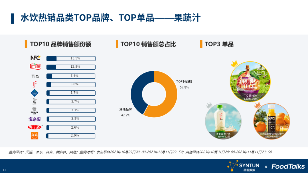 果蔬汁TOP10品牌销售额占水饮品类销售额的57.8%,其余品牌占比为42.2%。