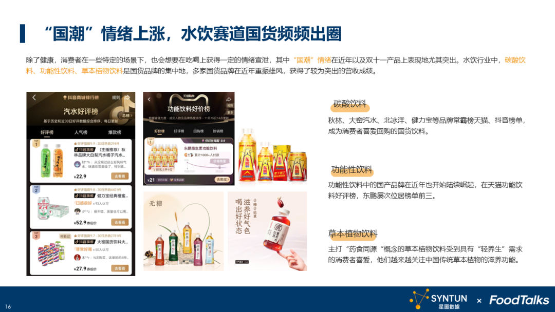 除了健康,消费者在一些特定的场景下,也会想要在吃喝上获得一定的情绪宣泄,其中“国潮”情绪在近年以及双十一产品上表现地尤其突出。水饮行业中,碳酸饮料、功能性饮料、草本植物饮料是国货品牌的集中地,多家国货品牌在近年重振雄风,获得了较为突出的营收成绩。