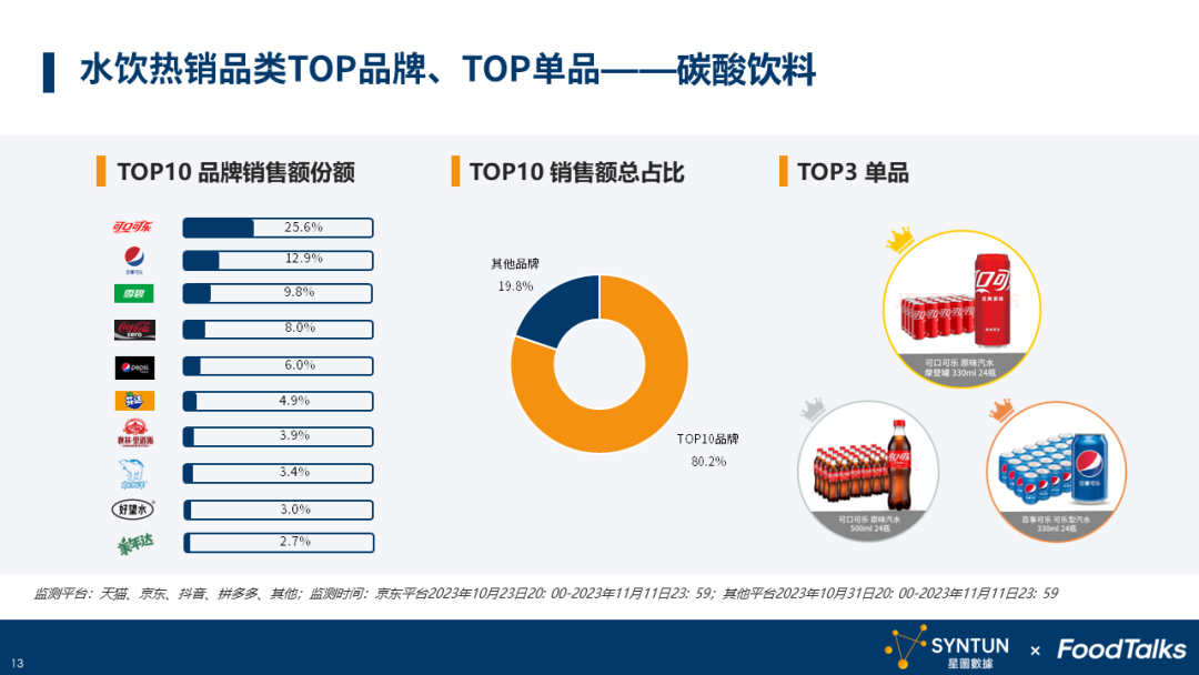 碳酸饮料TOP10品牌销售额占水饮品类销售额的80.2%,其余品牌占比为19.8%。