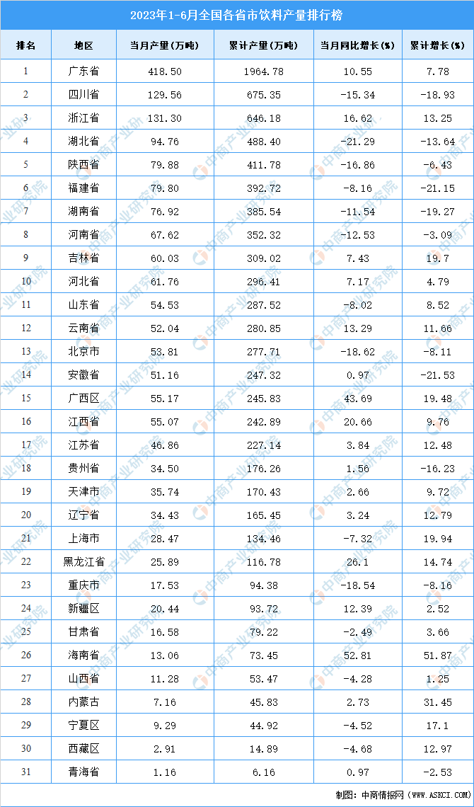 2023年上半年全国各省市饮料产量排行榜中商产业研究院 2023-08-07 1...