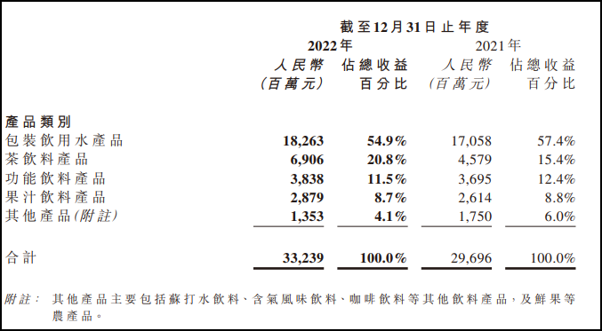 农夫山泉的另一大增长引擎茶饮料在2022年突飞猛进。去年,茶饮料收益69.06亿元,比2021年大幅增加23.27亿元,或同比增长50.8%;占总收益比例也达到了20.8%,或增加5.4个百分点。