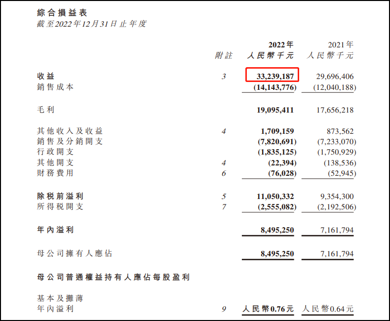 3月28日,农夫山泉发布2022年业绩。期内,总收益约为332.39亿元,同比增...