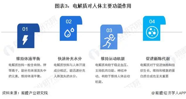 电解质有助于维持人体体液平衡、帮助快速补充水分、维持运动机能、促进新陈代谢,及时补充电解质有助于维持人体机能。鉴于当前市场对电解质饮料未有明确界定,本文参考《饮料通则》并根据谨慎性原则,对电解质饮料作如下界定:包装上明确标明为电解质饮料,且产品具备为人体补充电解质及水分功能的饮品,不含固态饮品。