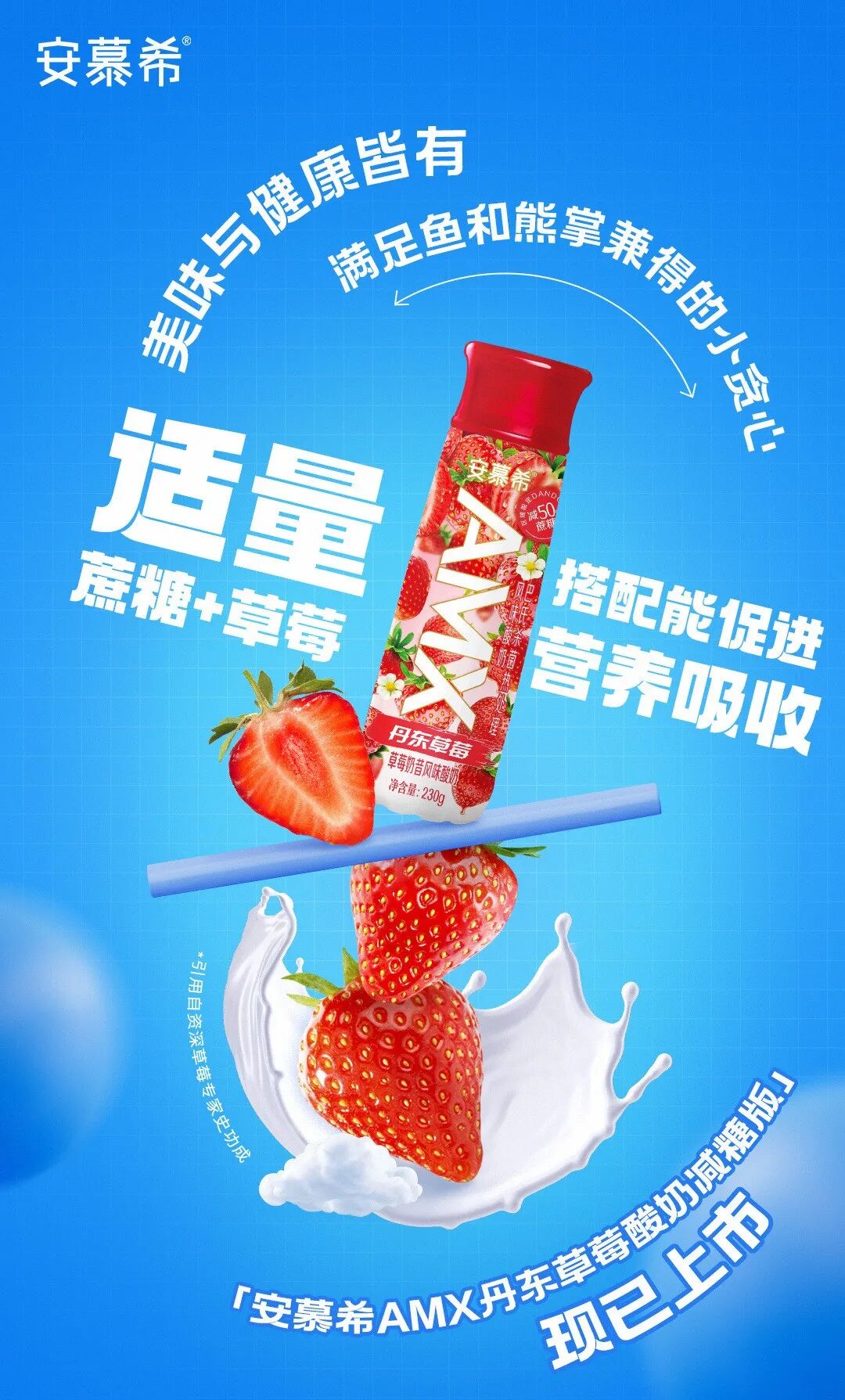 1月28日,安慕希官微宣布安慕希AMX丹东草莓减糖版全新上市,新品相比原版减少了50%的蔗糖添加。该产品选自丹东原产地直采的草莓,并经过12道精制工艺层层把关,同时还添加了10%草莓果酱与丝滑酸奶基底相融合。