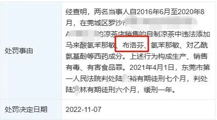 据天眼查App显示的决定书(东市监处罚〔2022〕181107187号),东莞市市场监管局查明:“两名当事人(店长陆某裕及店员陆某林)自2016年6月至2020年8月,在莞城区罗沙市场12号金沙综合市场A136之三的凉茶店销售的自制凉茶中,违法添加马来酸氯苯那敏、布洛芬、氯苯那敏、对乙酰氨基酚等西药成分,上述行为构成生产、销售有毒、有害食品罪。”