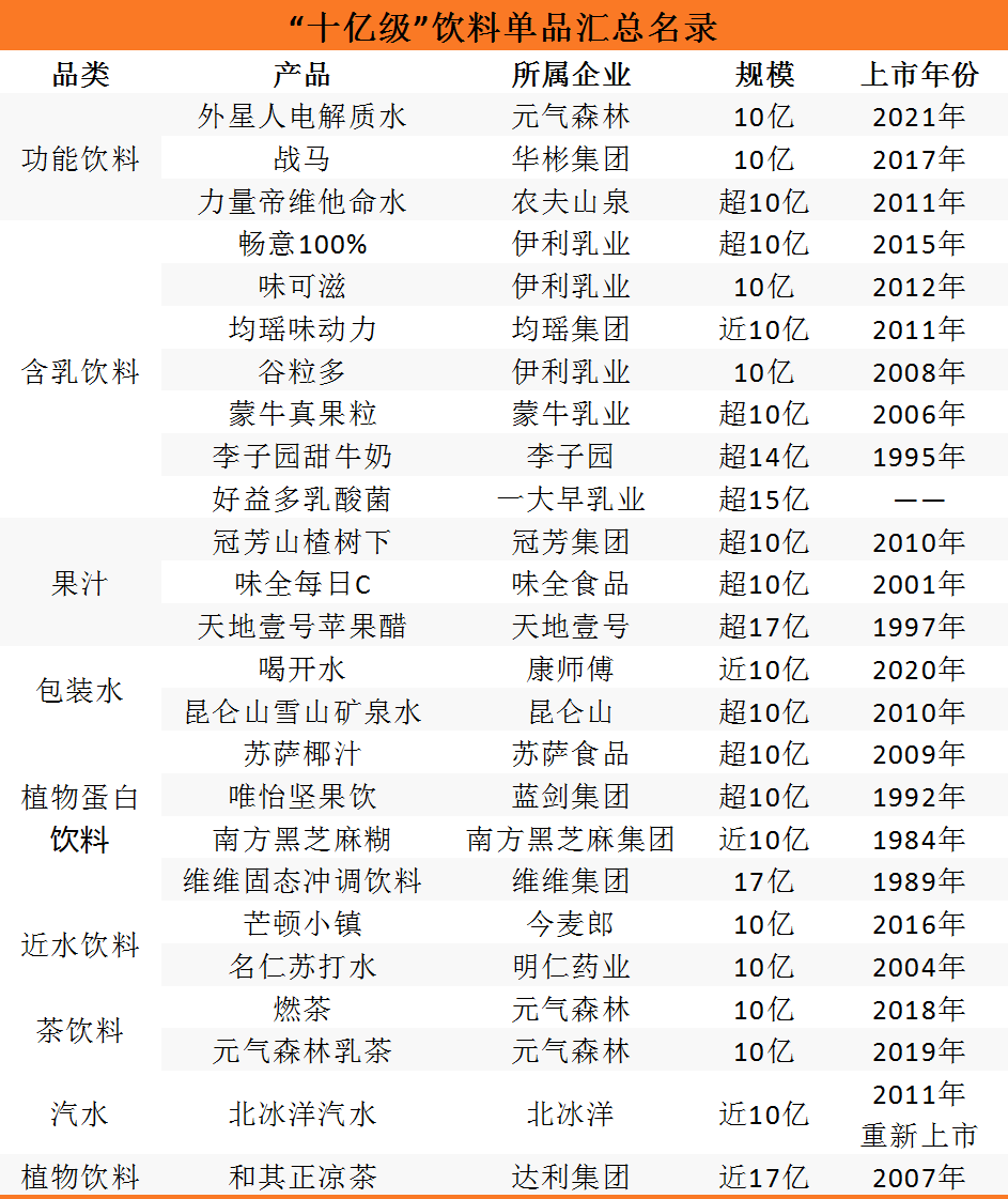 根据公开数据统计,目前饮料行业共有超20款“十亿级”单品,全面覆盖功能饮料、含乳饮料、果汁、包装水以及植物蛋白饮料等近十个品类。