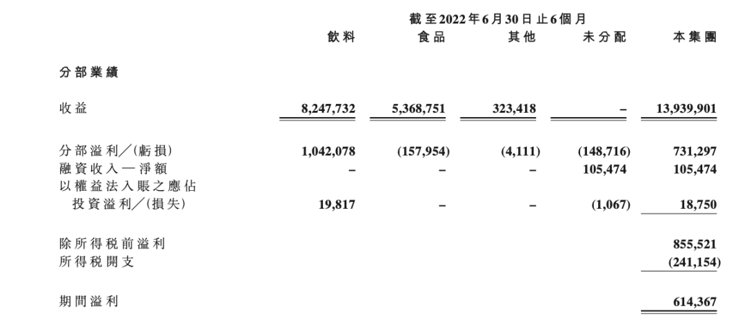 其中,饮品业务2022年上半年收入82.48亿元,较去年同期增长4.9%。