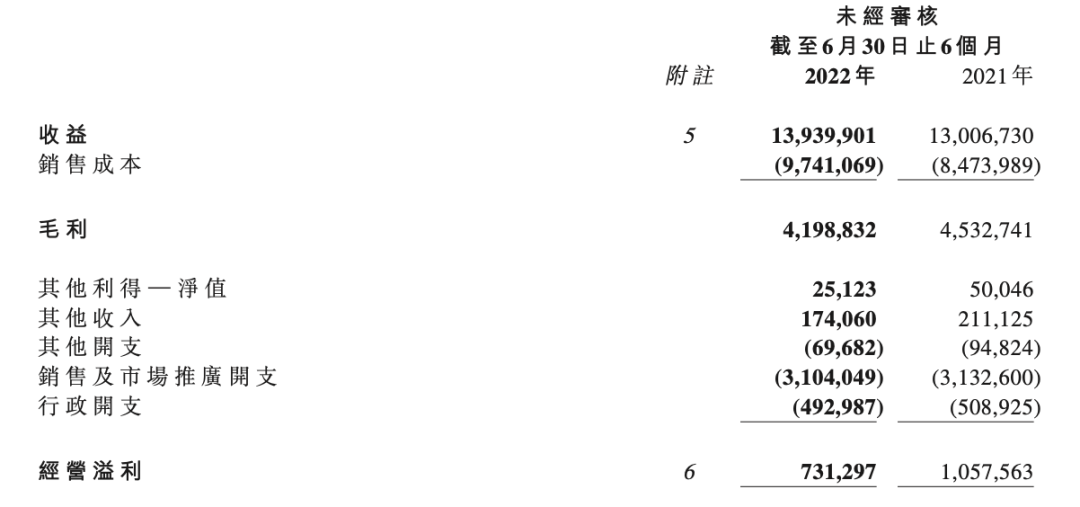 公司权益持有人期间应占溢利为6.14亿元,同比下降27.5%。统一企业中国在公告称,集团毛利额于回顾期内下降至约41.99亿元,较去年同期下降7.4%;毛利率由去年同期的34.8%下降4.7%至30.1%,主要受大宗原物料价格上涨、国际油价及疫情影响运输费用增加所致。